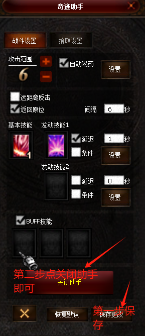 打开Z助手 设置好技能后,操作如下 退到登陆服务器界面后关闭游戏即可
